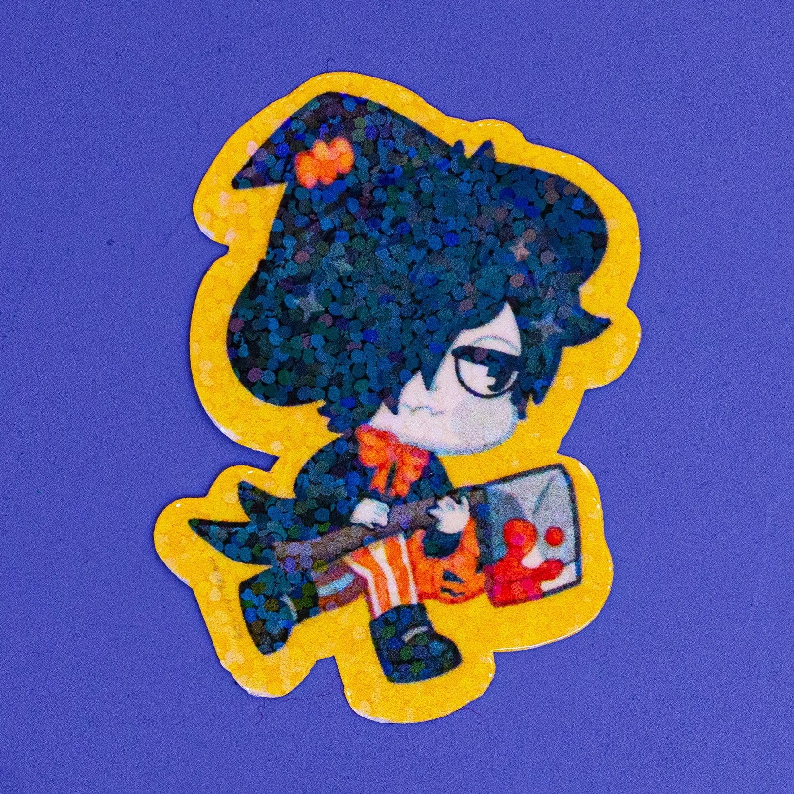 A spooky holographic sticker with a sparkly finish! Don't mind what he's holding there ๐
