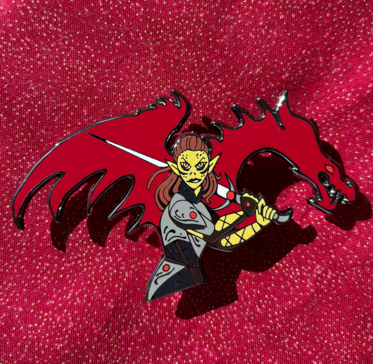 Lae'zel is 3 inches wide, with hard enamel, black nickel plating and three pin posts. This listing is for seconds grade pins.