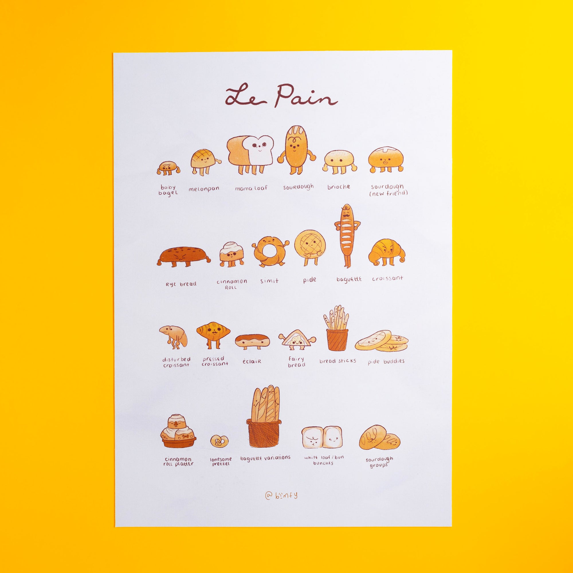 Get acquainted with these dashing breads! This line up features characters as seen in Bimfy's student film 'Le Pain' - but also serves as a bread directory for any bread lover :)) (Available in A4 or A3!)