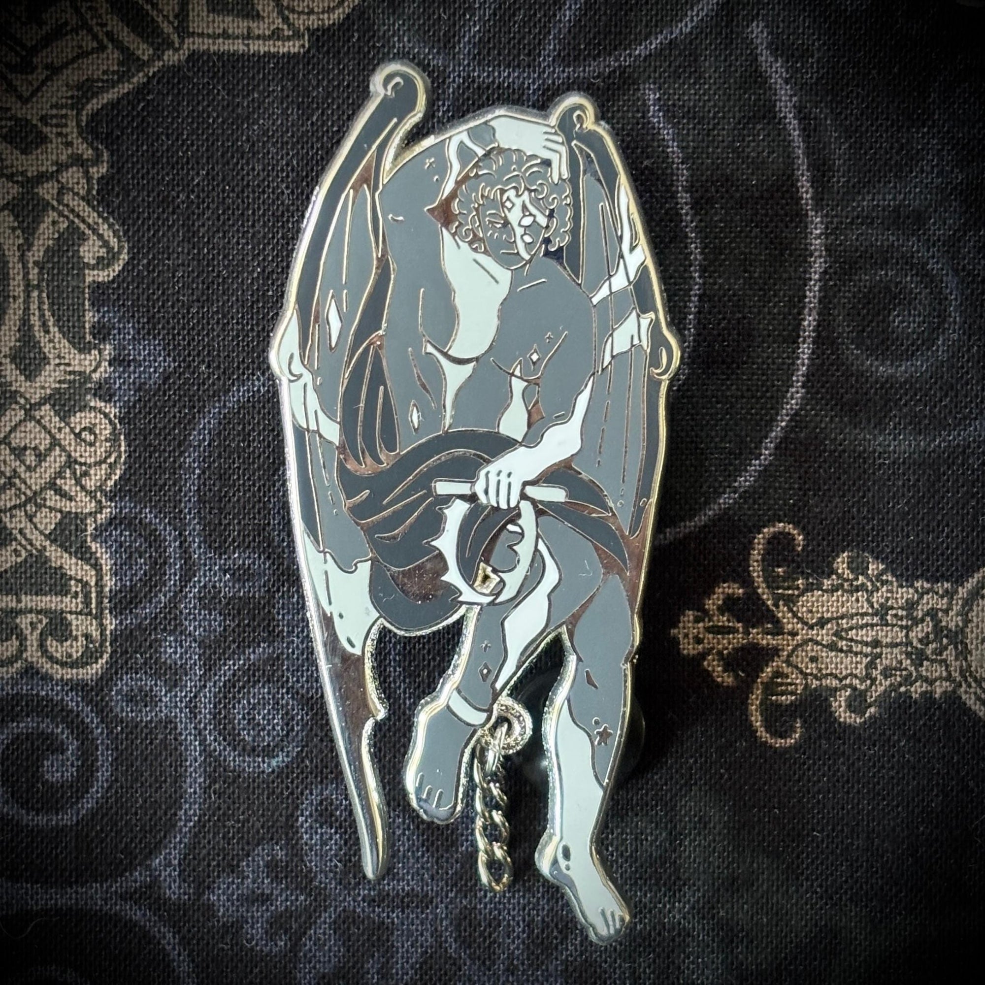 Inspired "The Lucifer of Liège" by Guillaume Geefs. Each pin is 2.5 inches long, with hard enamel, silver plating, two pin posts with rubber backings, and a chain accent.