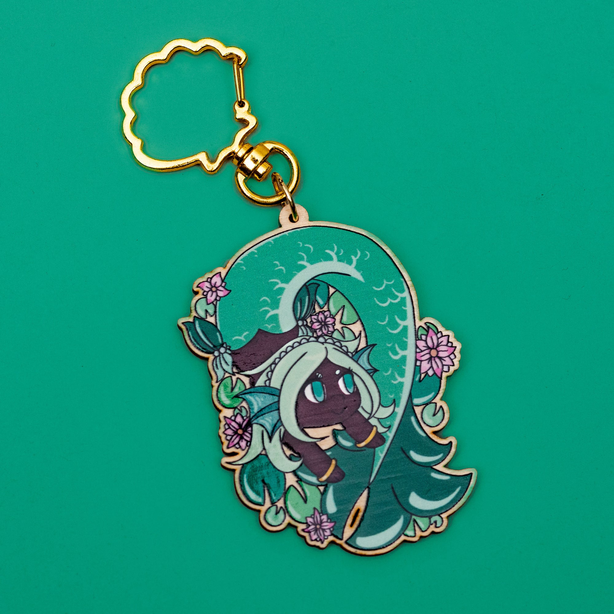 Matcha's here to brighten your day! This wooden charm features a super glossy finish so Matcha looks like she's underwater! This design is also available as a sticker and a print.