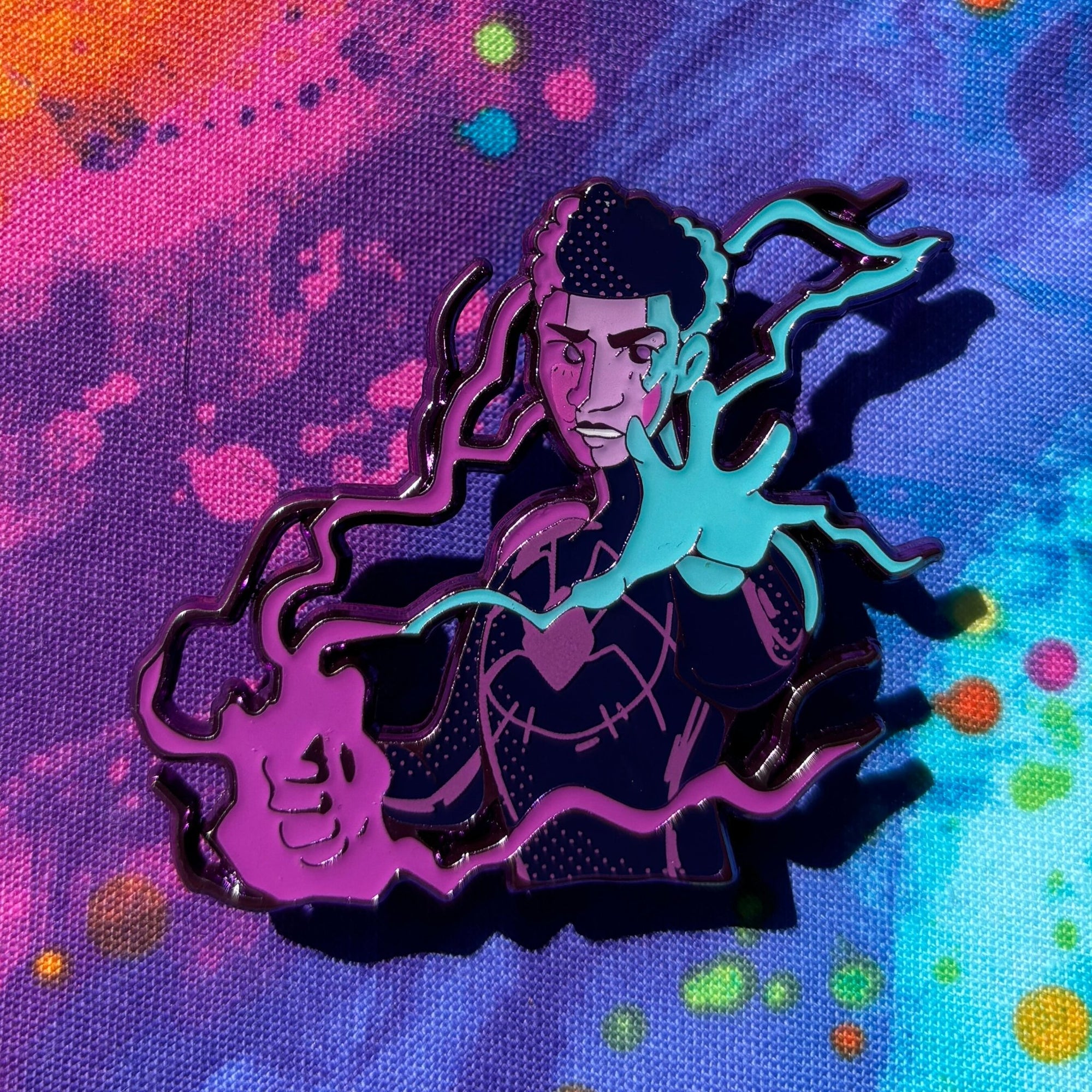 | Inspired by the scene in the second Spiderverse film where Miles uses his electricity powers! Miles is 2 inches wide, with purple chrome plating, soft enamel with epoxy, and screenprint. He has two pin posts with rubber backings. |