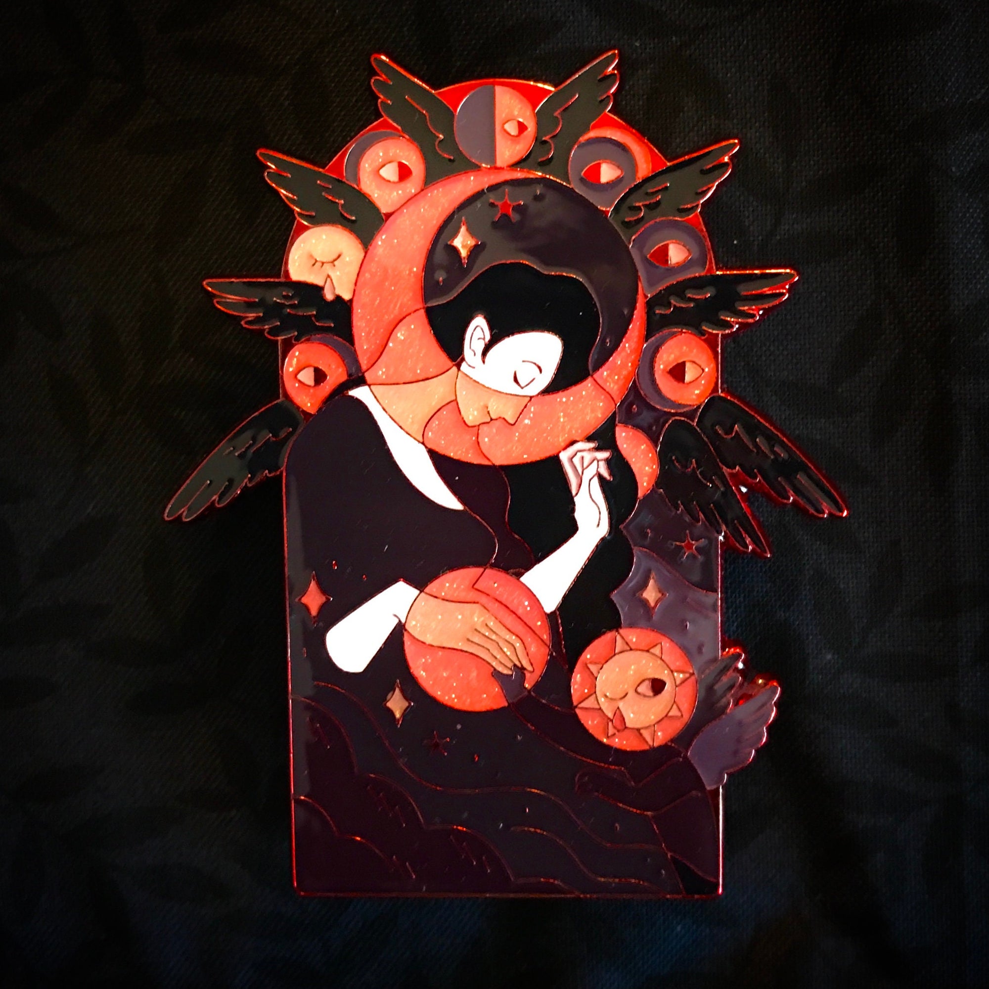 Each pin is 2.8 inches (7 cm) long with two pin posts and rubber backings. It is available in two colorways: Blood Moon, with red chrome plating, soft enamel and epoxy, and glitter accents; and Starry Night, with hard enamel, gold plating, and glitter & pearl accents. This listing is for standard grade pins only. Standard grade pins may have one or two tiny imperfections. For my complete pin grading policy, please see my About & FAQ: linktr.ee/ultra.infinite