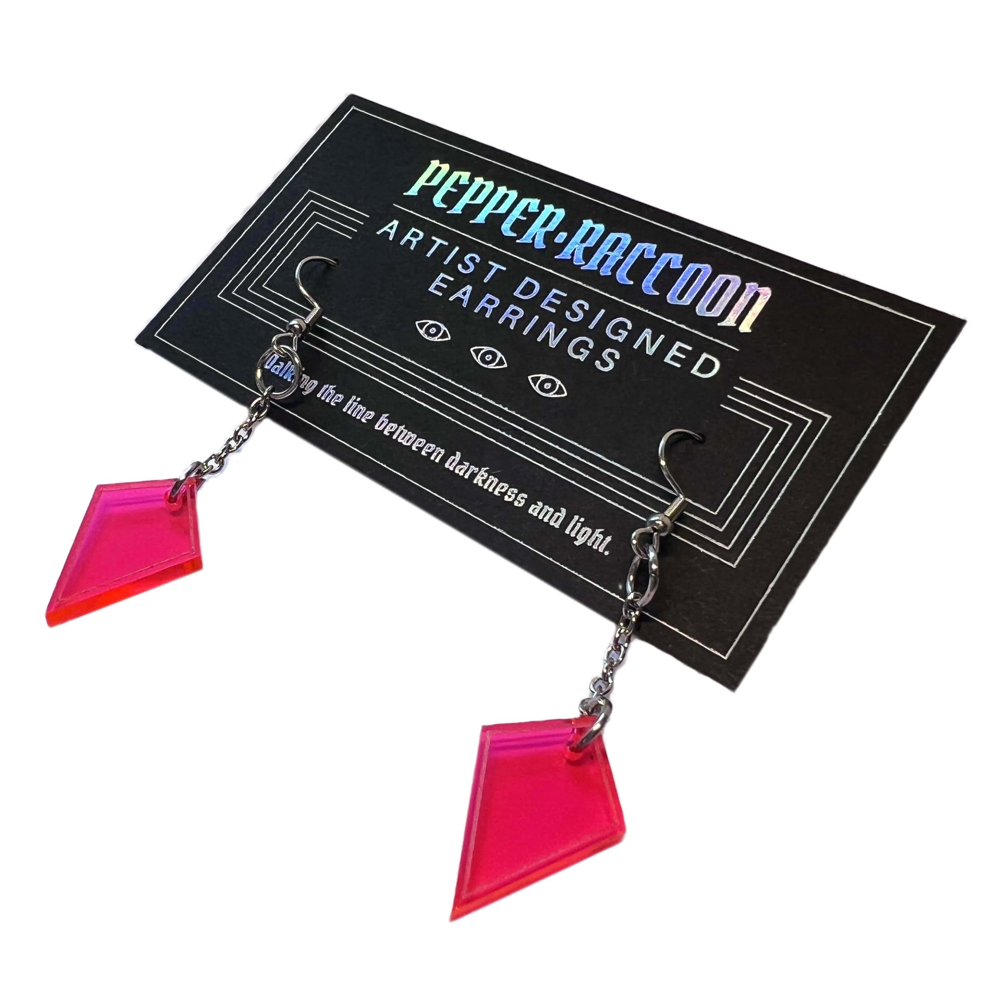 This neon acrylic has become a mainstay of my designs because I absolutely love how bright and magical it is. These hand-crafted chain diamonds feature delicate laser-etched detailing and an edgy vibe. Smaller than the similar Chain Arrows for those who prefer a shorter hang length.