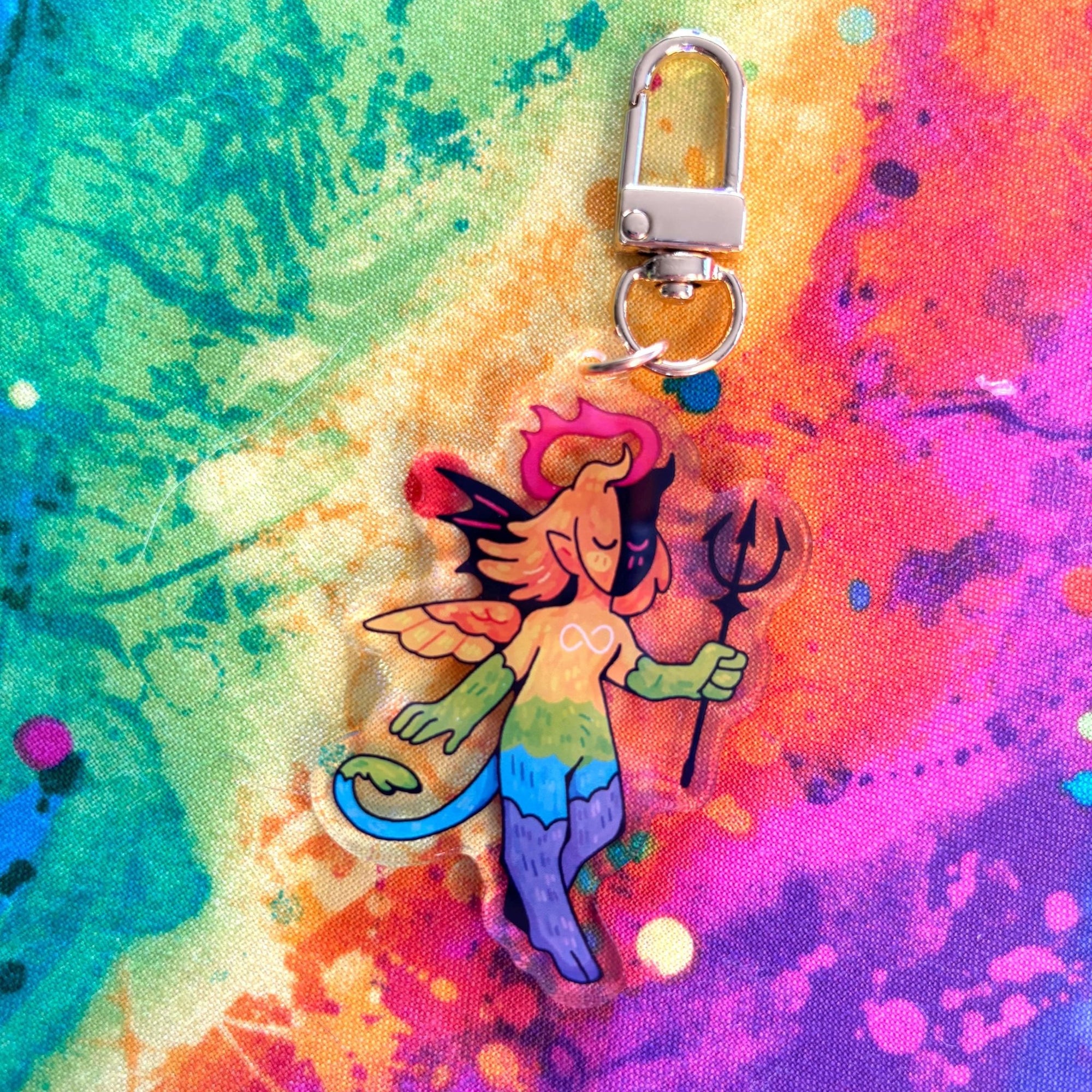 | This acrylic keychain is 2.5 inches (6.3 cm) on the longest side, double-sided with the same print on both sides; it has a gold lobster clasp. |