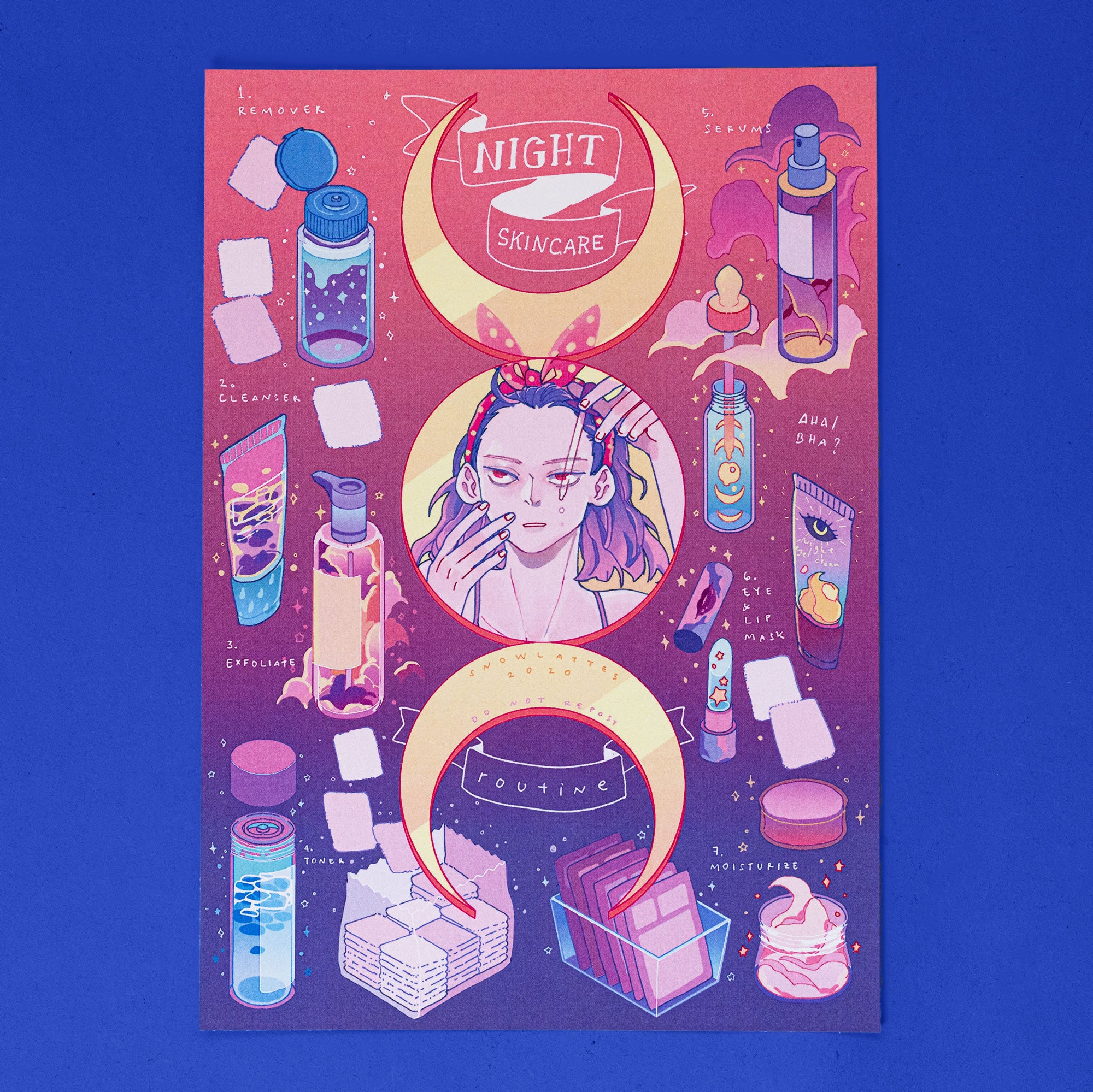 Unwinding after a hard's day at work with this Nighttime skincare routine. Always stay hydrated and moisturised!Featuring a skincare illustration series by Snowlattes available in 2 printed designs โ Morning Skincare and Night Skincare.