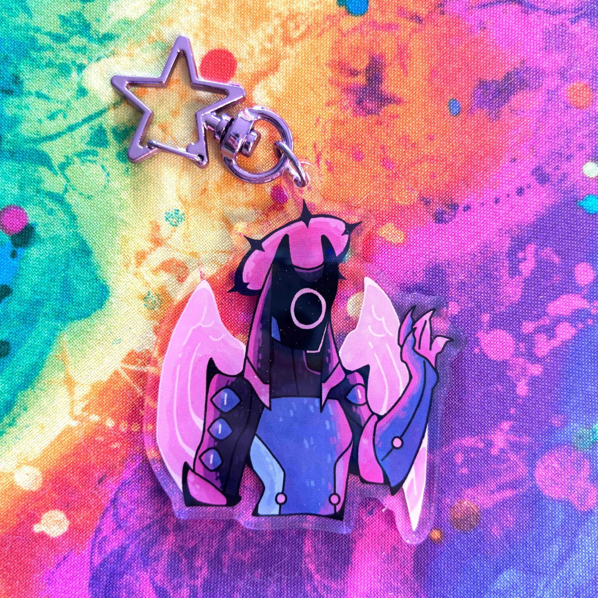 | This acrylic keychain is 2.5 inches (6.3 cm) on the longest side, double-sided with the same print on both sides; it has a purple star clasp. |