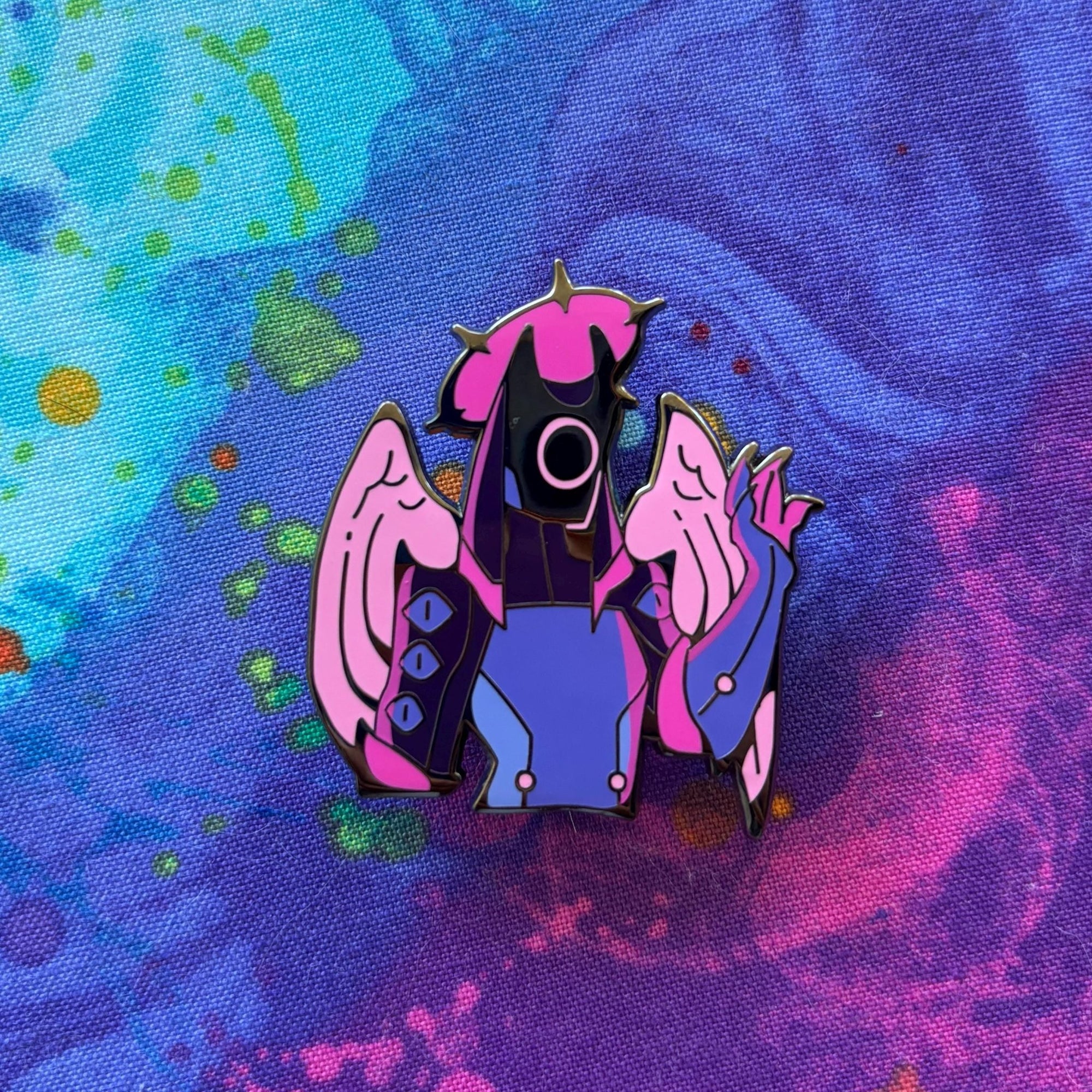 This pin is 1.7 inches long with black nickel plating and screenprint. It has hard enamel, two pin posts, and rubber backings.