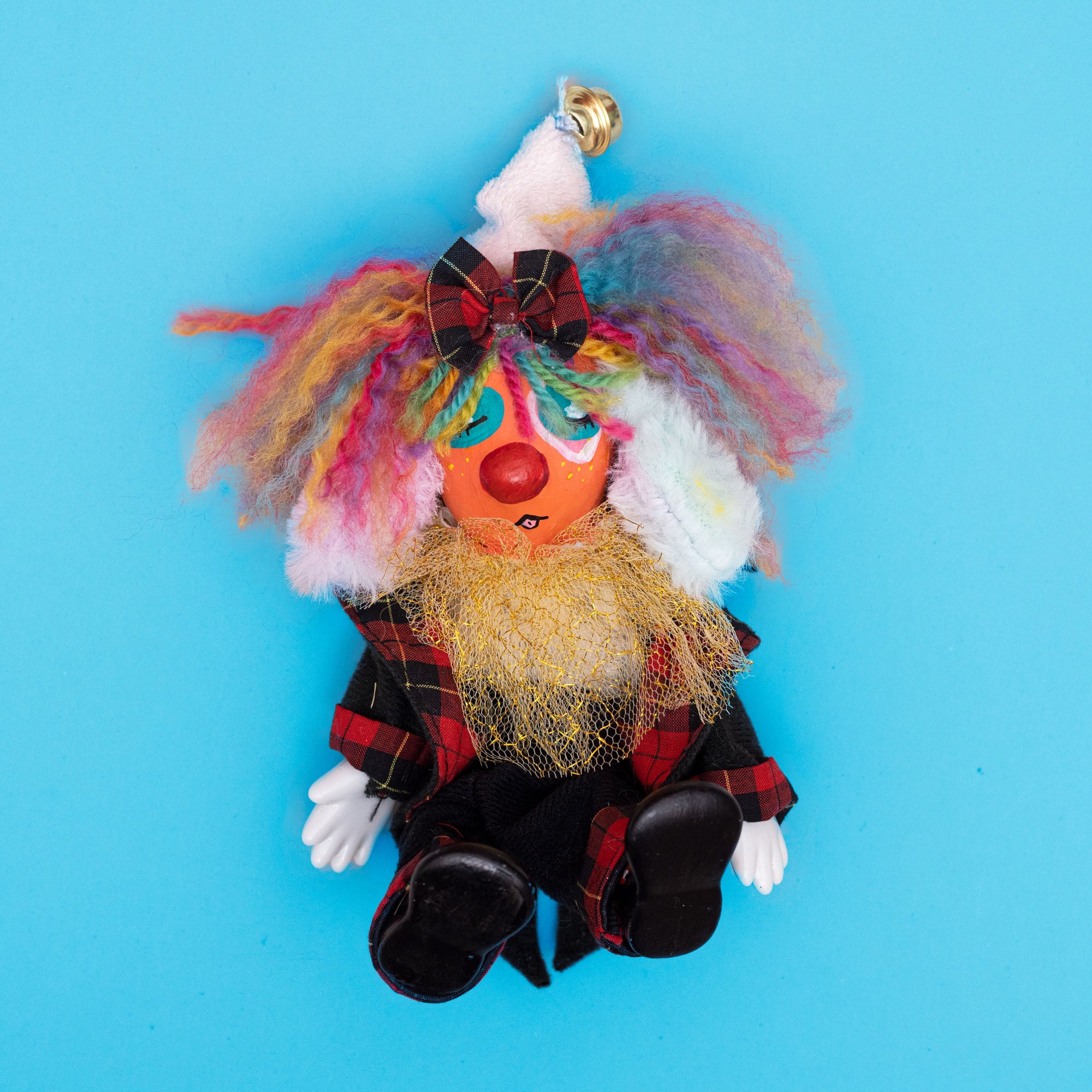 A sleepy orange puppy with pastel ears and rainbow yarn hair. They have a flair for red plaid and black. Clown school can get really tiring sometimes!