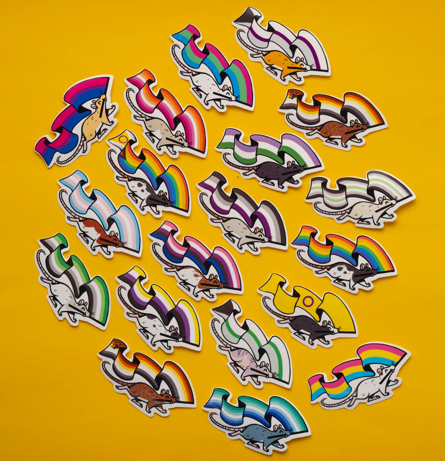Part of a set of 3 sticker designs, available individually or as a set. Perfect for mixing and matching with the other Pride Rats in different flags and styles!