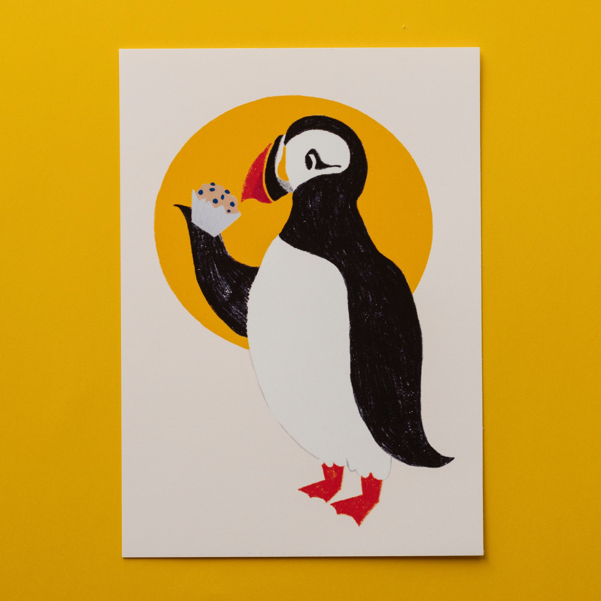 Have you ever seen a puffin, eating a muffin? he does love blueberry. Printed on high quality 229gsm (60 lb.) Matte Photo Paper. 5 x 7 in.