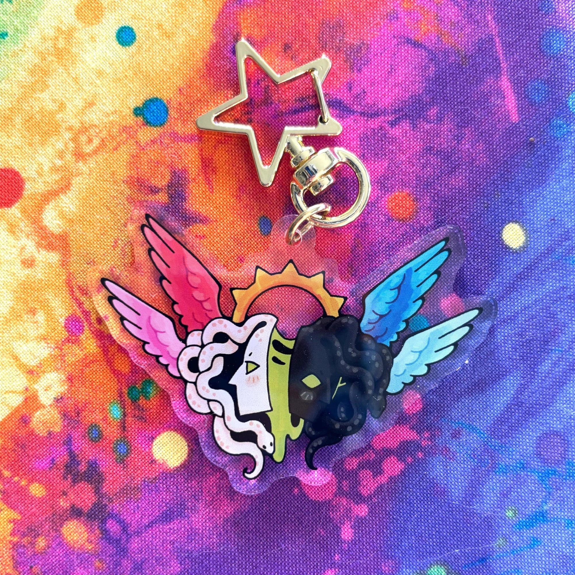 This acrylic keychain is 2.5 inches (6.3 cm) on the longest side, double-sided with the same print on both sides; it has a gold star clasp.