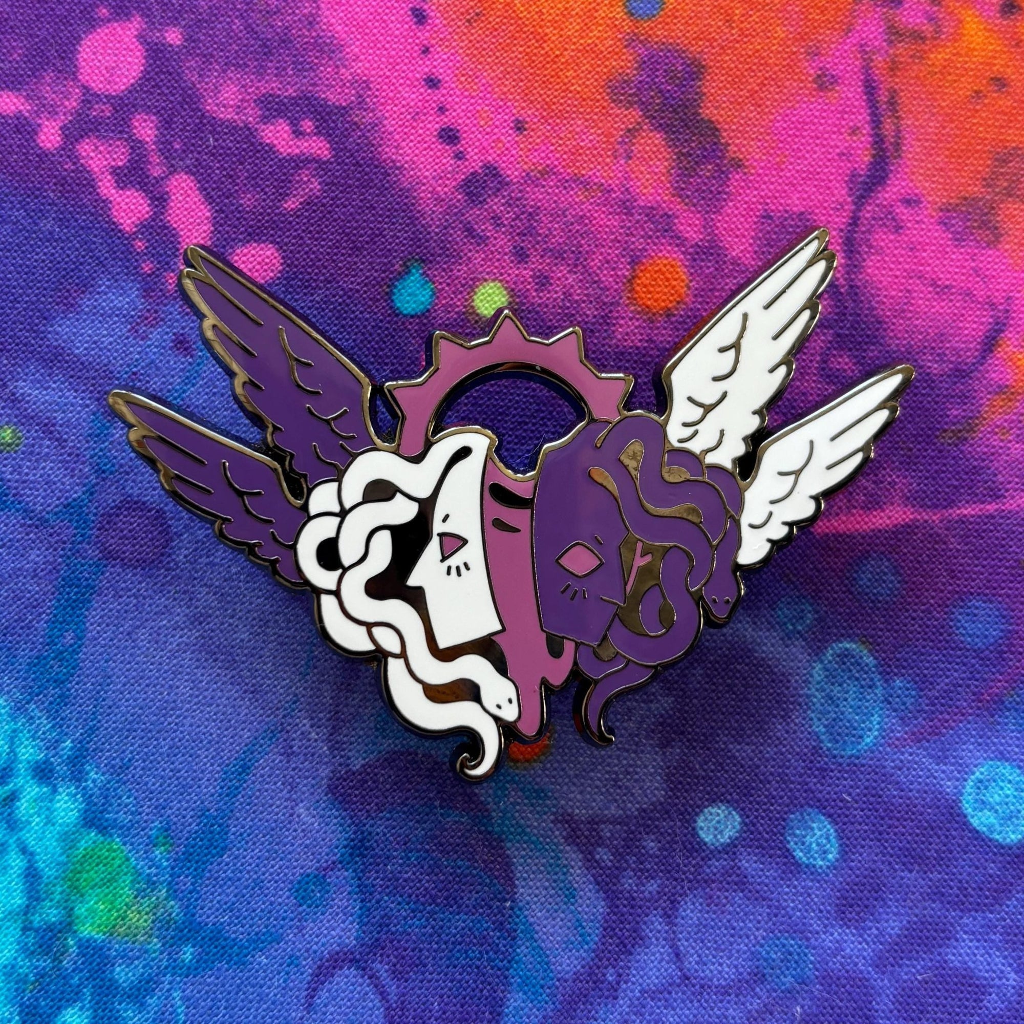 | This pin is 2.3 inches wide with black nickel plating. It has hard enamel and two pin posts with rubber backings. |