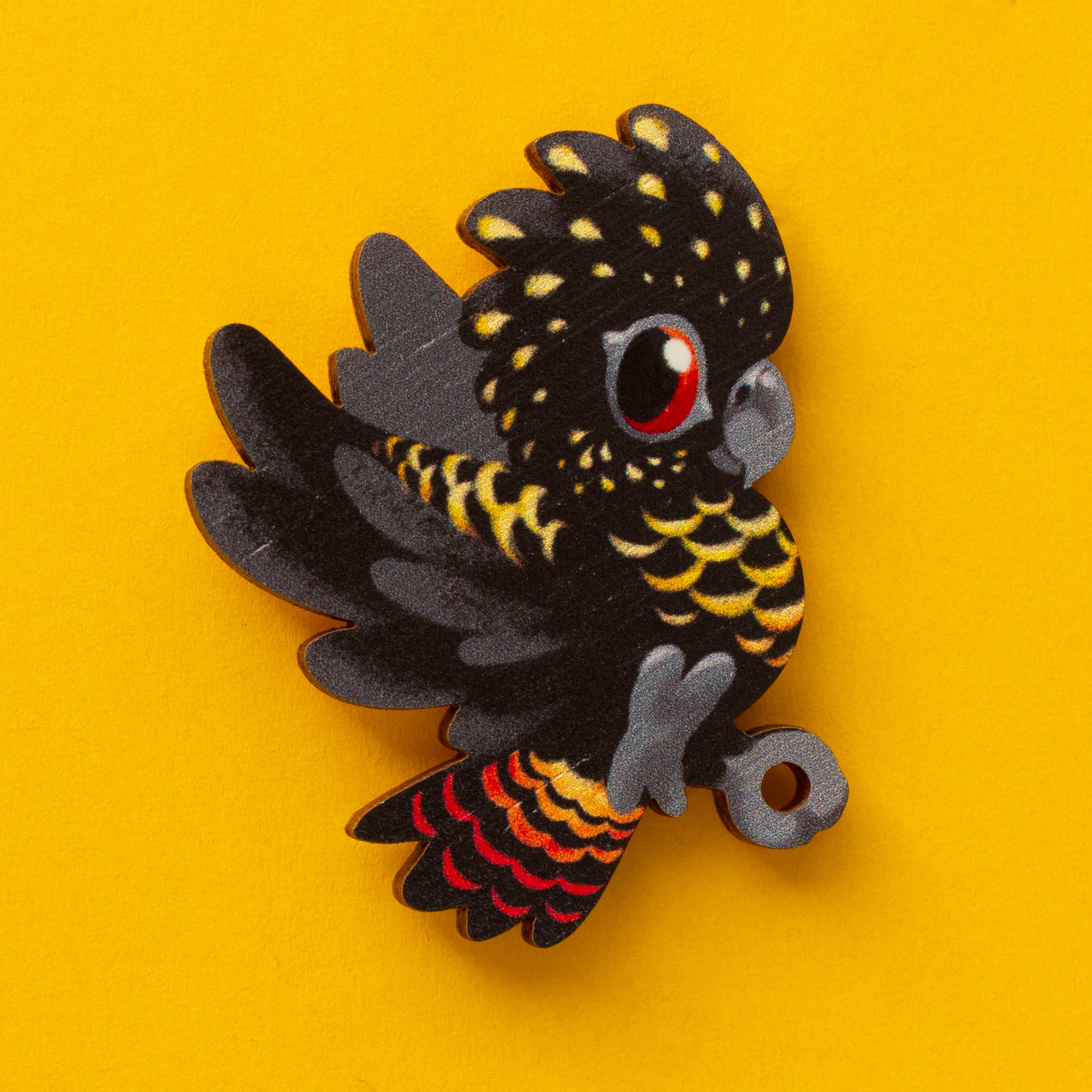 These little Aussie cockatoo pins are printed in full colour on sustainably sourced wood! They have two pin posts on the back to keep them securely in place wherever you put them (unlike the real thing) and feature a little gloss finish on their eyes for that extra spark of life when they catch the light.