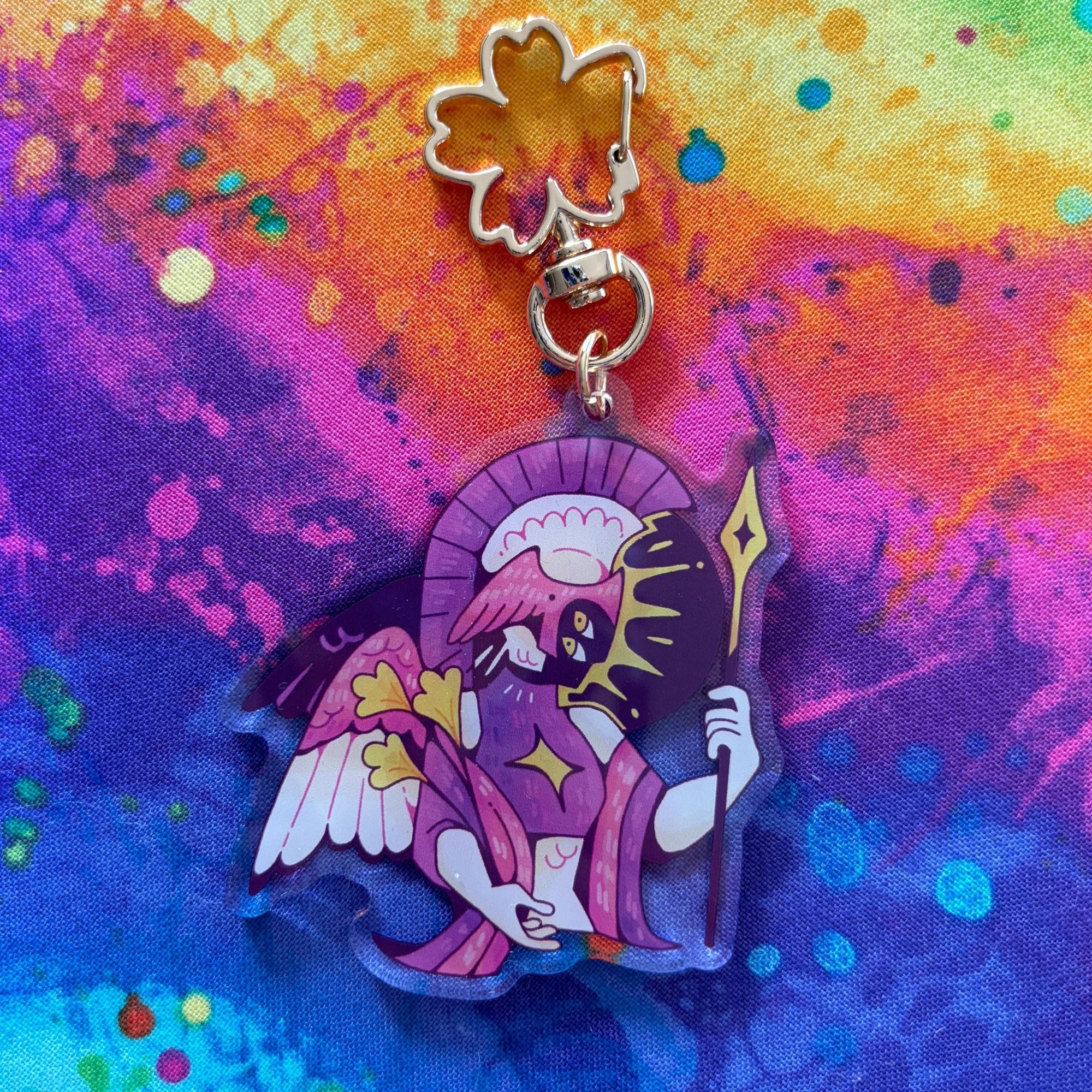 | This acrylic keychain is 2.5 inches (6.3 cm) on the longest side, double-sided with the same print on both sides; it has a gold flower clasp. |