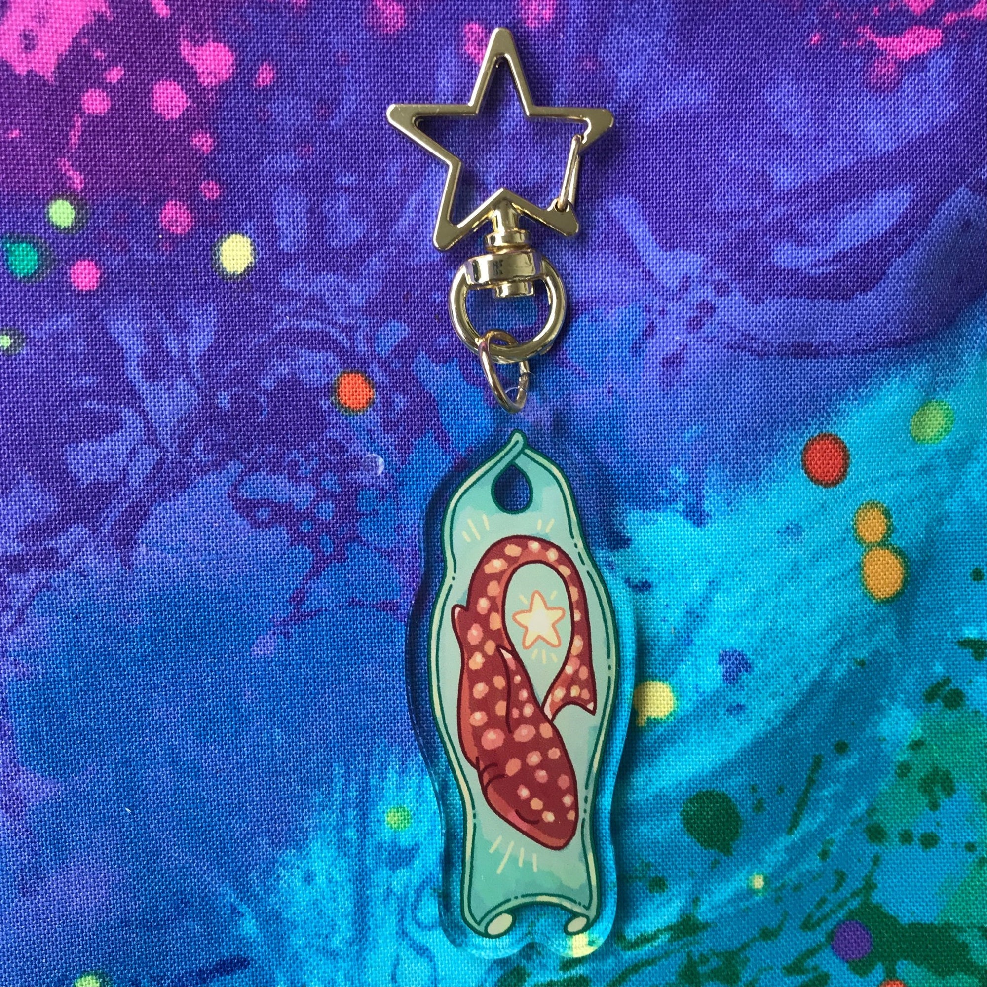 This acrylic keychain is 2.5 inches (6.3 cm) long, double-sided with the same print on both sides. The keychain has a gold star clasp.