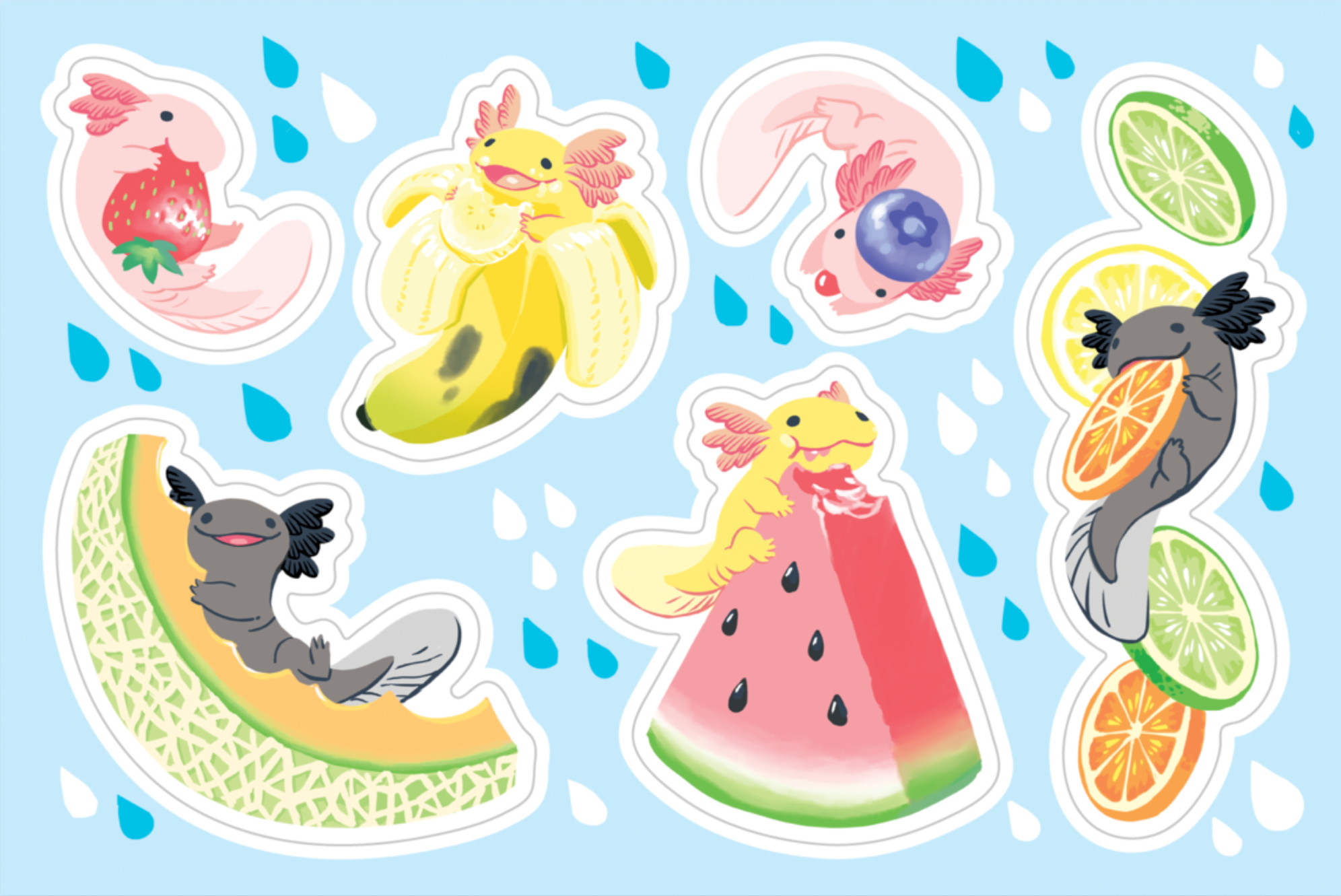 These axolotls need alotl snax to get through the long day. Hashtag relateable?? Whether you're into healthy snacks or salty sweet snacks, there's a snaxolotl out there who understands completely. Each sticker sheet measures 4x6 inches and each character sticker is kiss cut so that you can easily peel them off the sheet. The borders are also transparent, so stick them anywhere without a white border getting in the way! This sturdy weatherproof gloss laminated vinyl will hold up to 5+ years outdoor use / heavy handling too! Great for phones, handheld consoles, vehicles, etc.
