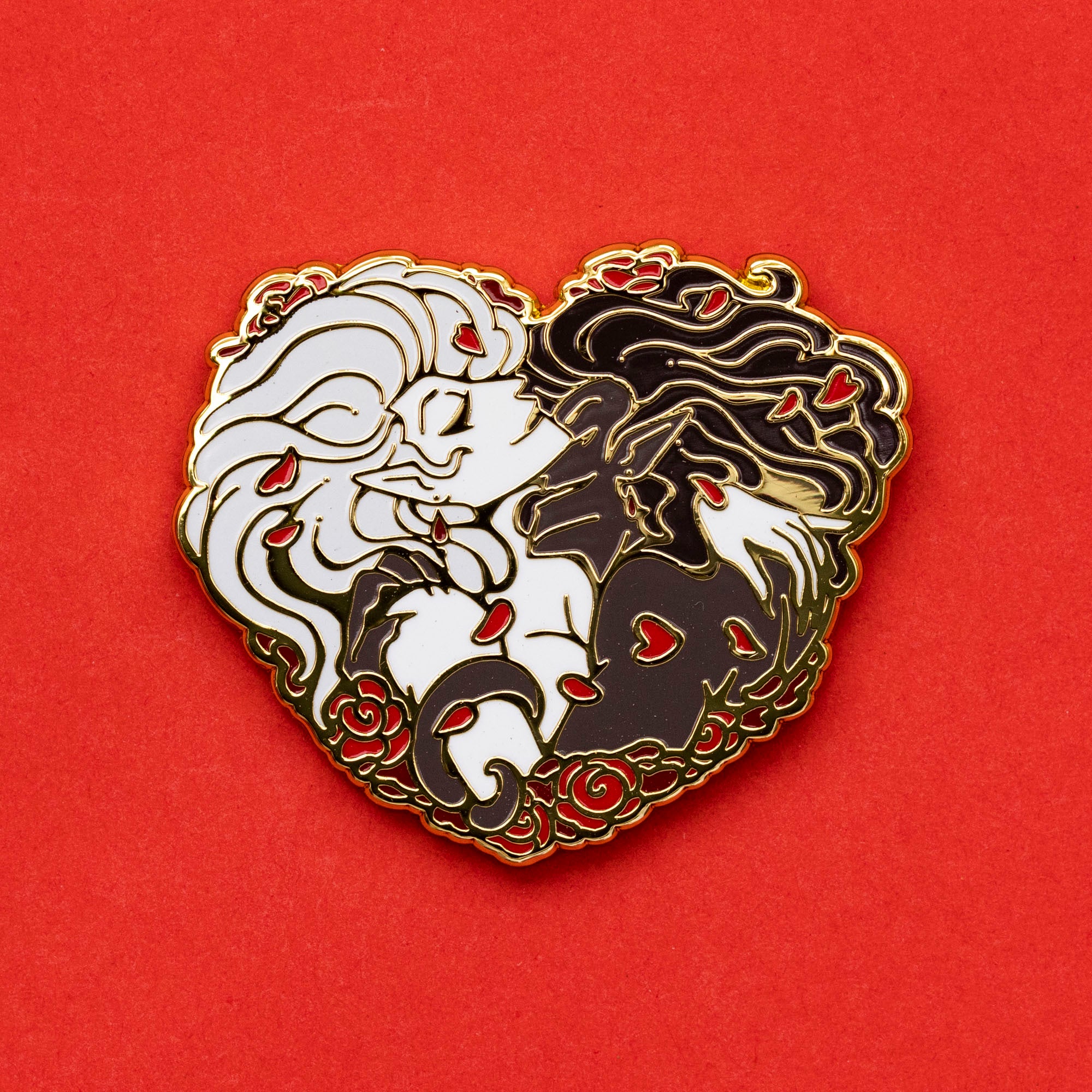 Two vampiric lovers, wreathed in roses.This pin features original characters belonging to myself and @wyrmzier.