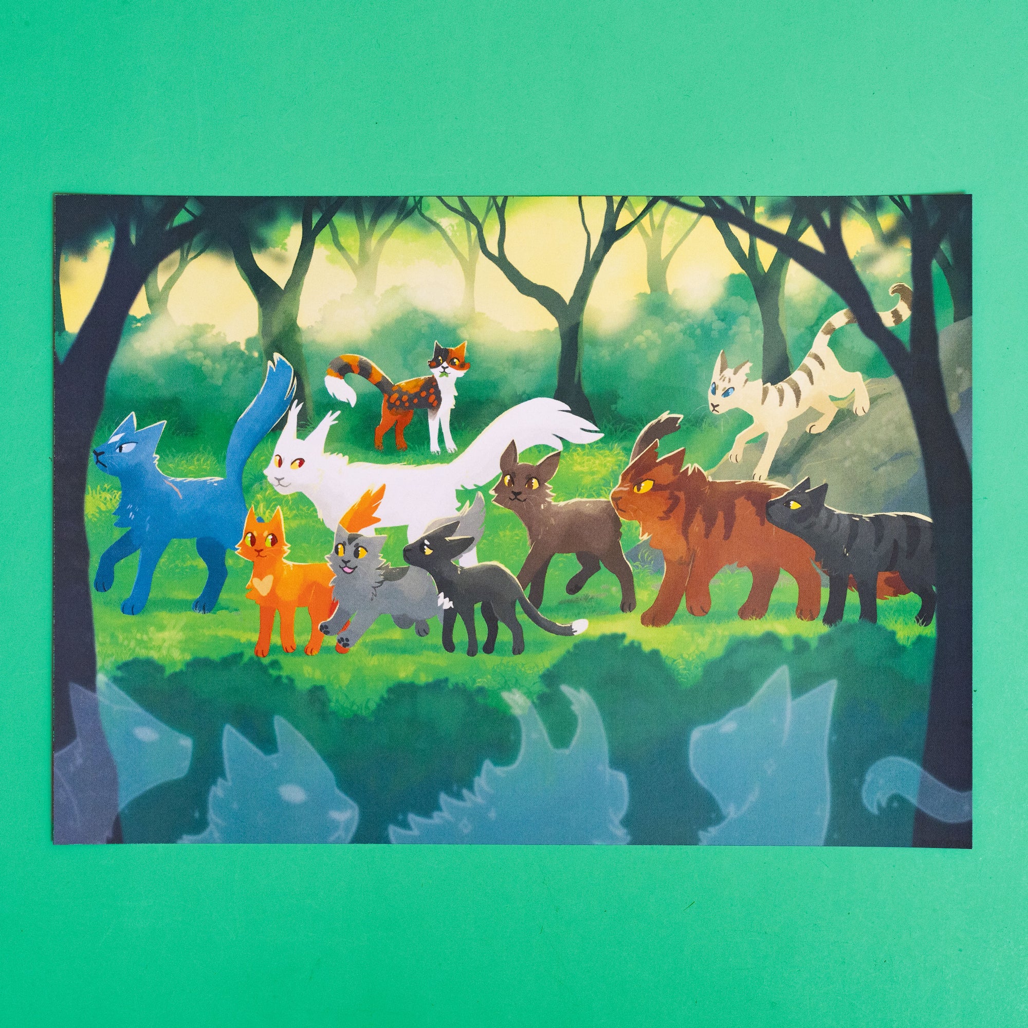 This illustrated print by Meroaw portrays a group of cats in a forest setting, inspired by the Warrior Cats series.
