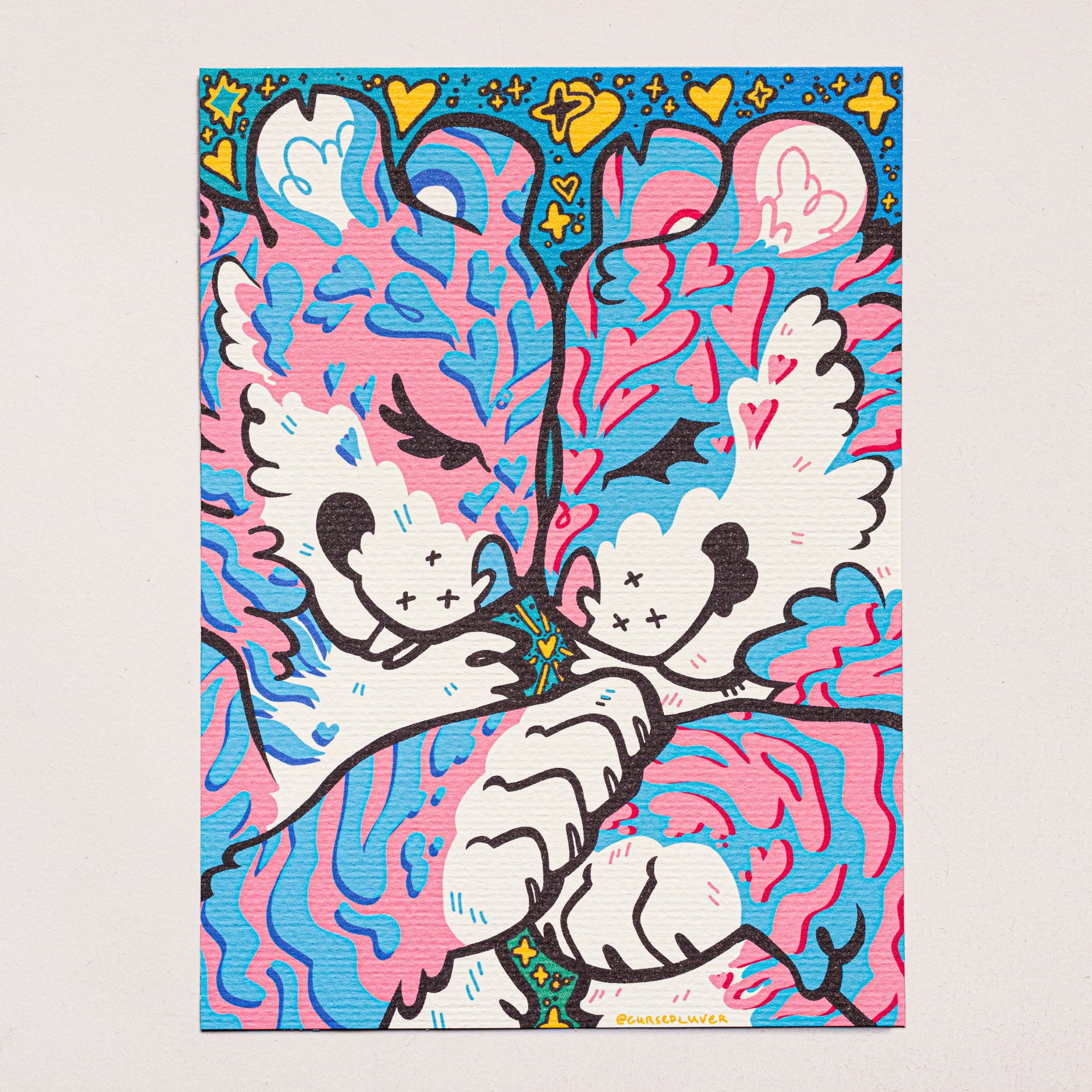 transcendent transgender tigers touching tenderly <3 an original illustrated print by CURSEDLUVER printed on textured felt board.
