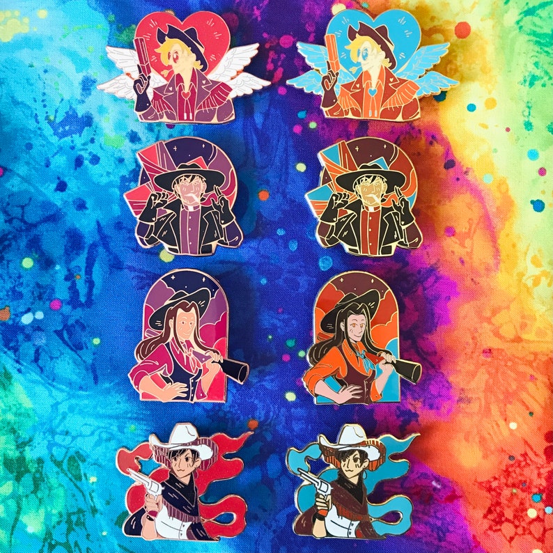 The Trigun gang with a cowboy twist! These pins are available in two colorways: purple or blue. The purple has glow accents and copper plating. The blue has gold plating. All the pins are hard enamel.Vash is 2.6 in (6.6 cm) wide. Wolfwood is 1.8 in (4.5 cm) long.Milly is 2 in (5 cm) long. Meryl is 2 in (5 cm) wide.This listing is for seconds grade pins only. Seconds grade pins have noticeable flaws, including but not limited to: smudges, specks or bubbles in the enamel, under-filled or over-filled enamel, chips or dents in metal and metal-plating, tarnish, missing or mis-colored enamel, loose pin posts, fused metal, missing metal, missing varnish, uneven linework, bends, scratches, etc. For my complete pin grading policy, please see my About & FAQ: linktr.ee/ultra.infinite