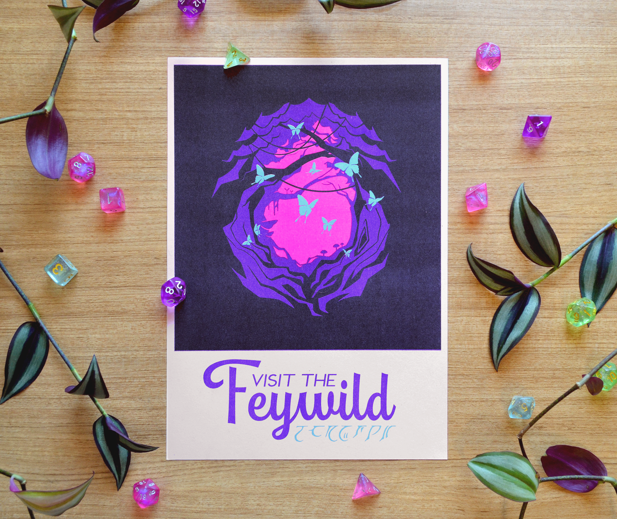 A tourism poster for the Feywild, featuring a silhouette of trees lit up by bright pink light, and dotted with butterflies. A4 size, risograph printed on 100% recycled 150gsm Envirocare paper