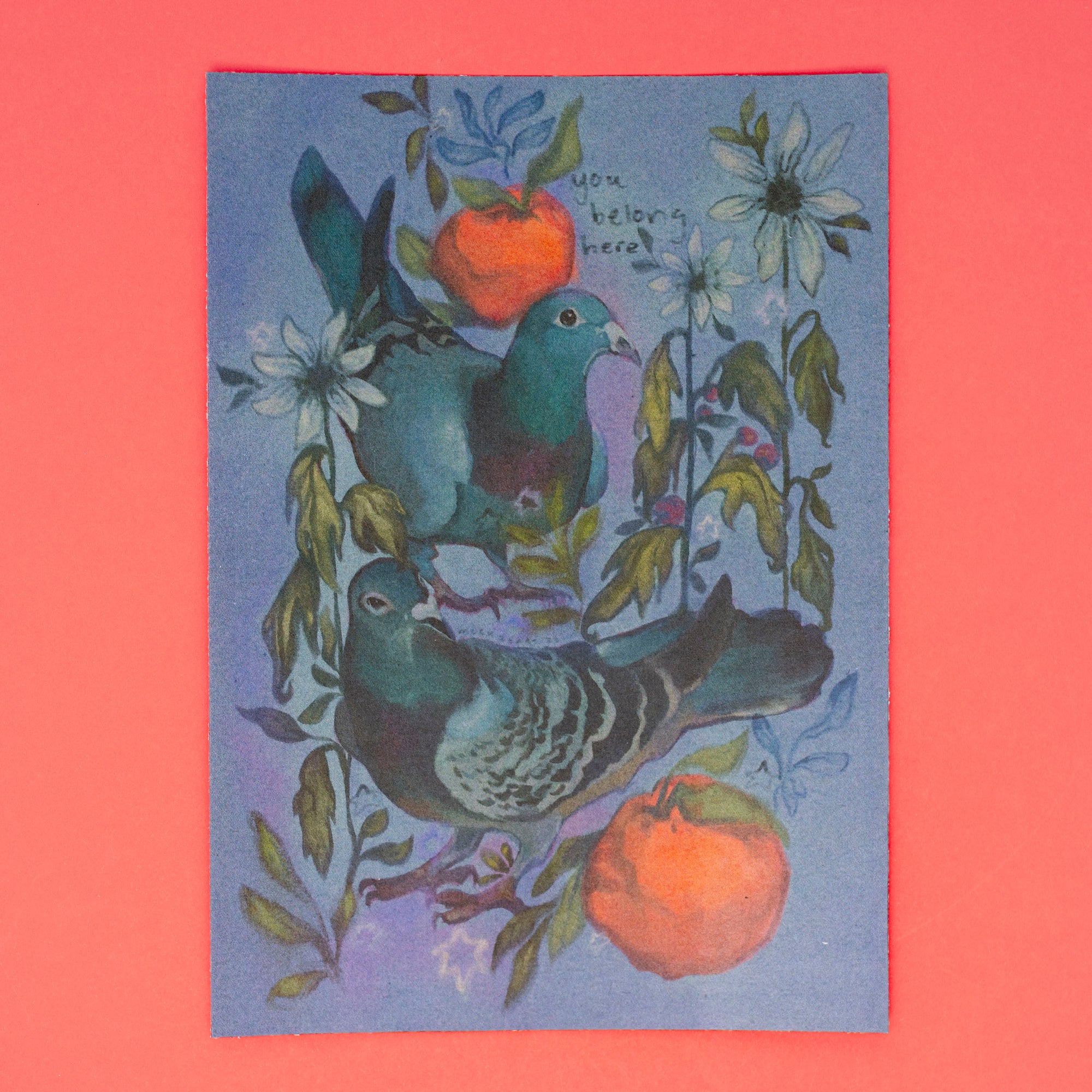 mushbeast's best selling print on multiple platforms & in-person. these pigeons are here to remind you that you belong wherever you are, no matter what others say or think.